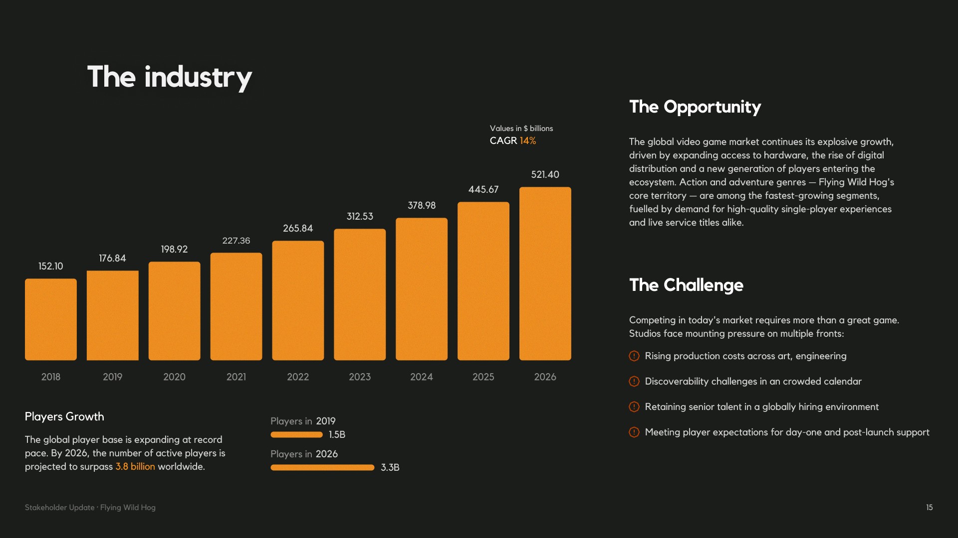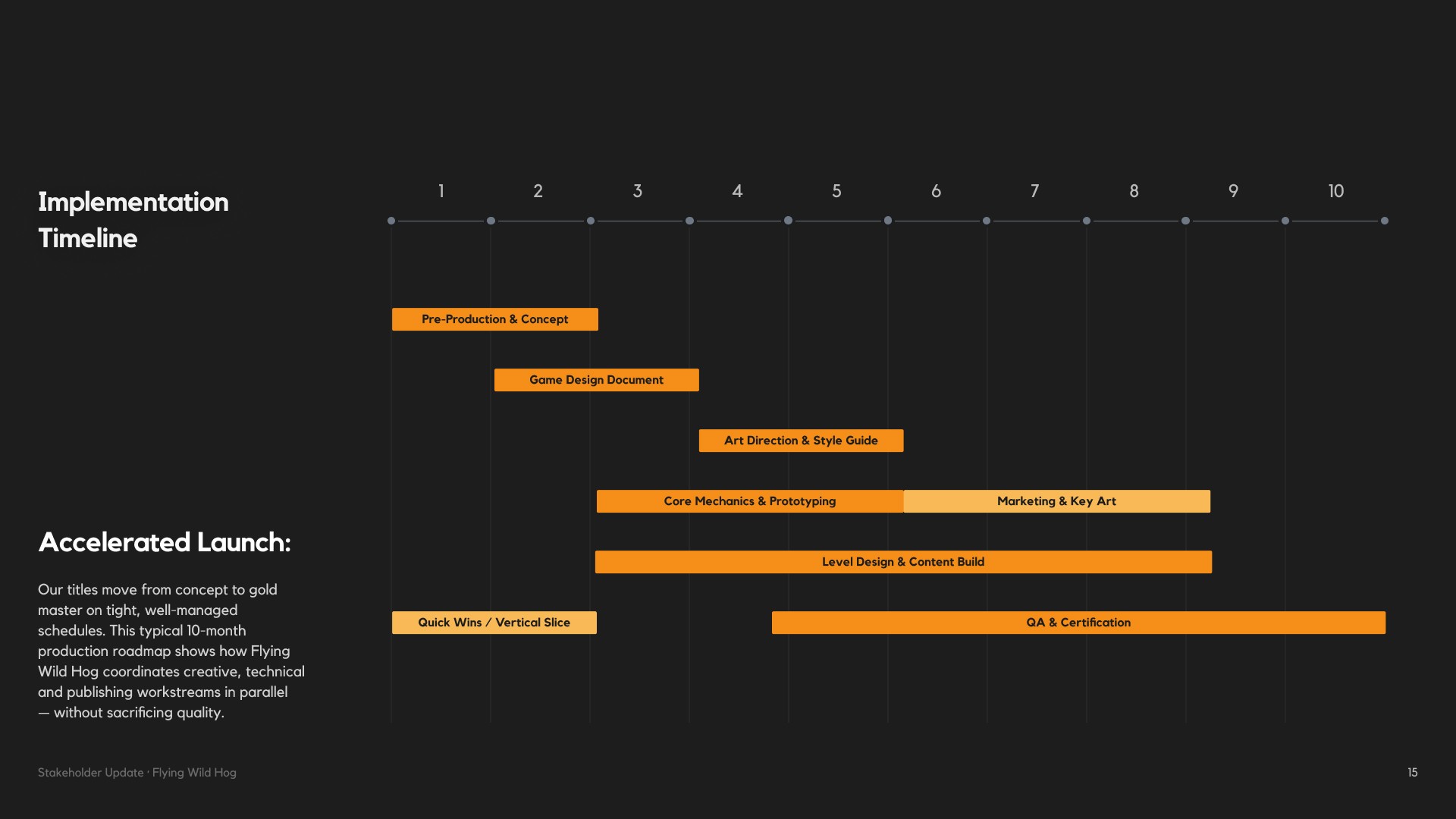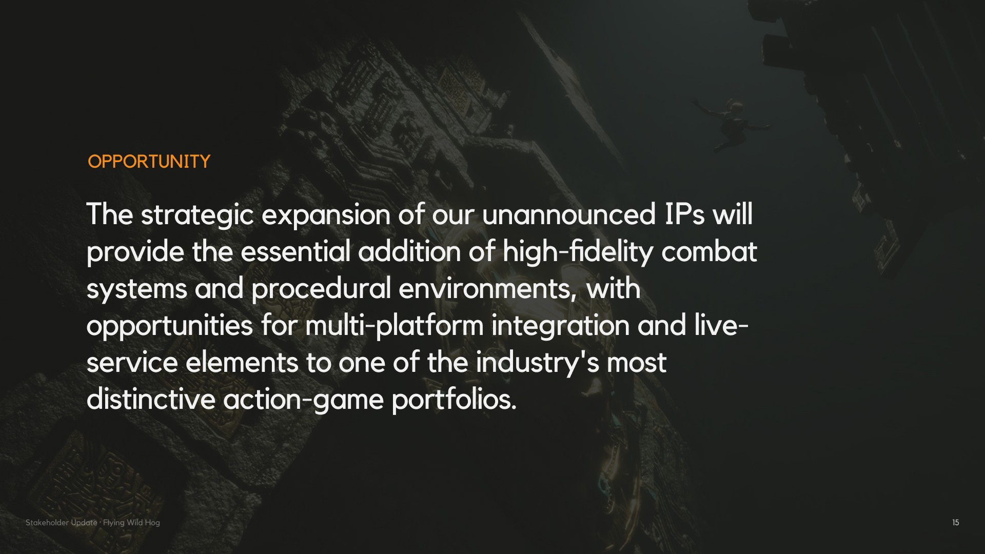 Flying Wild Hog needed a presentation that could speak to stakeholders — not just with numbers, but with narrative. The challenge was to take a wide range of information: studio history, game catalogue, headcount data, market positioning and future strategy, and shape it into a cohesive story that felt as dynamic as the games they make. The presentation had to balance credibility with personality, giving investors and partners a clear picture of where the studio has been, how it has grown, and where it is headed next.