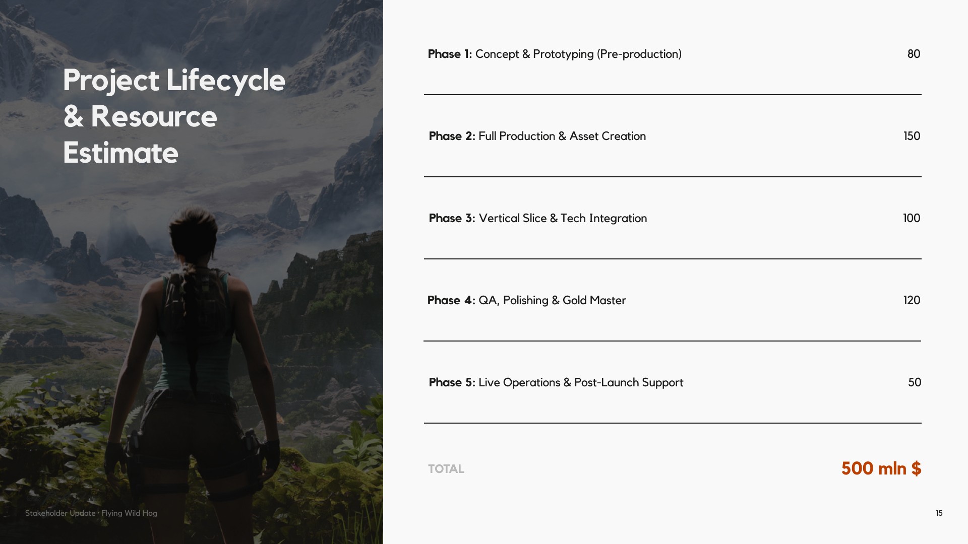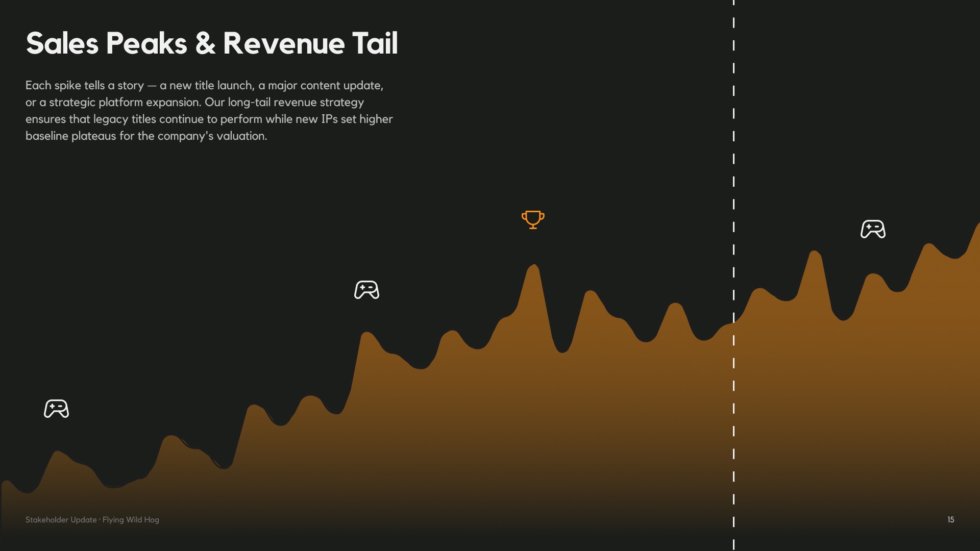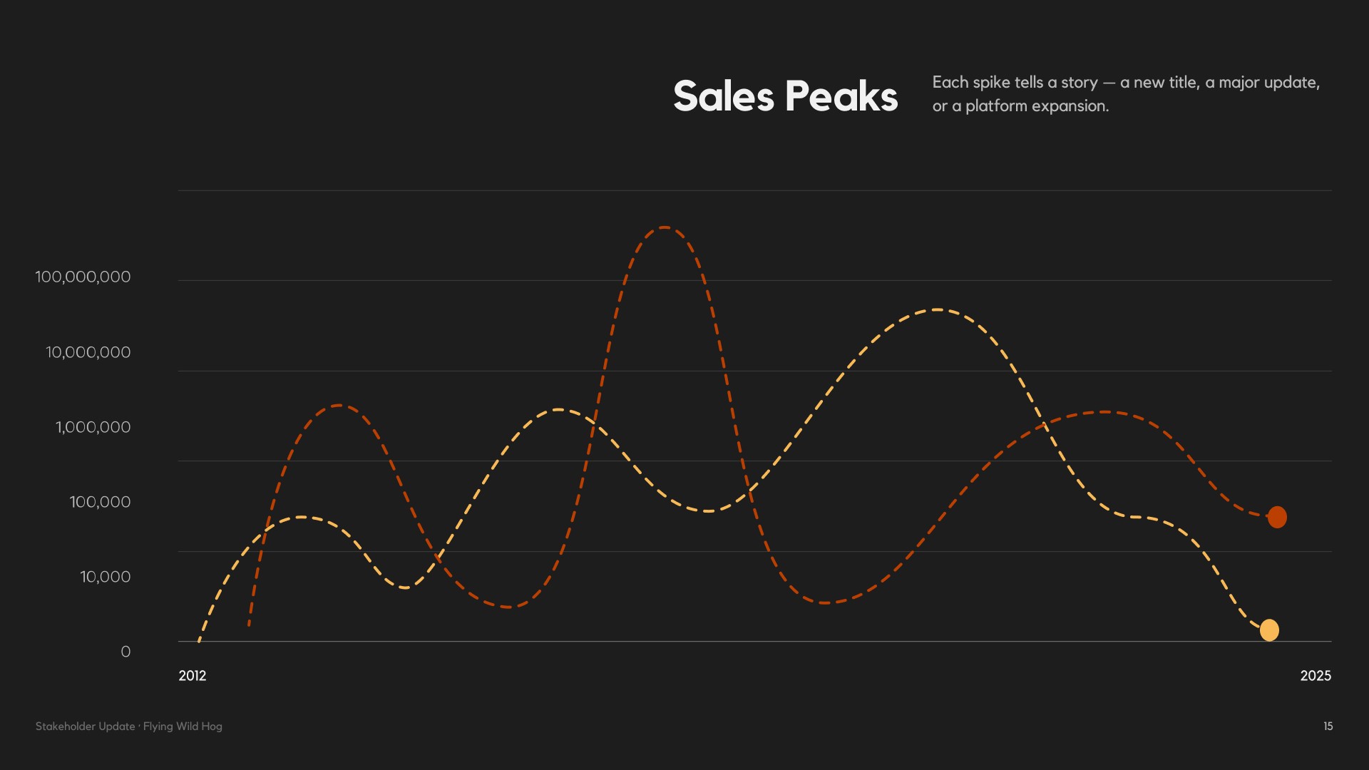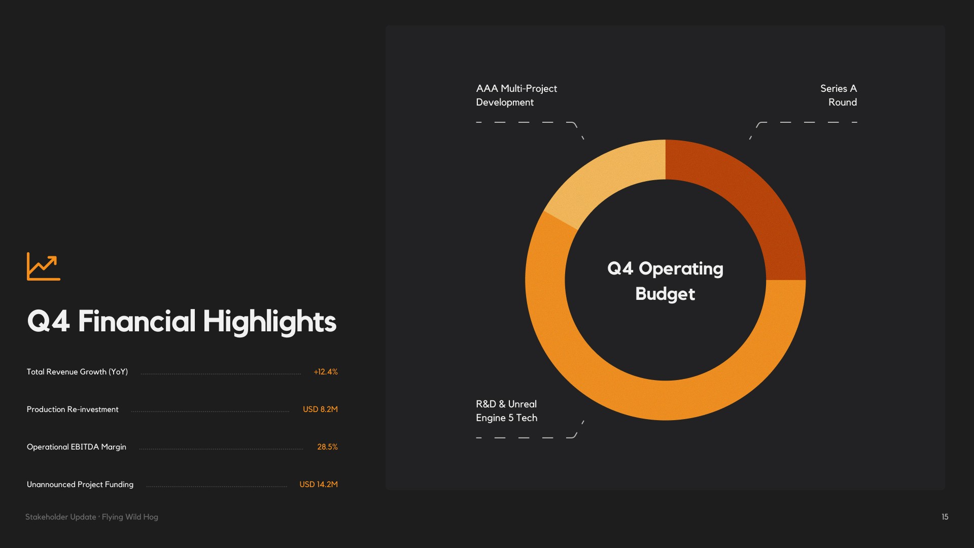 Flying Wild Hog needed a presentation that could speak to stakeholders — not just with numbers, but with narrative. The challenge was to take a wide range of information: studio history, game catalogue, headcount data, market positioning and future strategy, and shape it into a cohesive story that felt as dynamic as the games they make. The presentation had to balance credibility with personality, giving investors and partners a clear picture of where the studio has been, how it has grown, and where it is headed next.