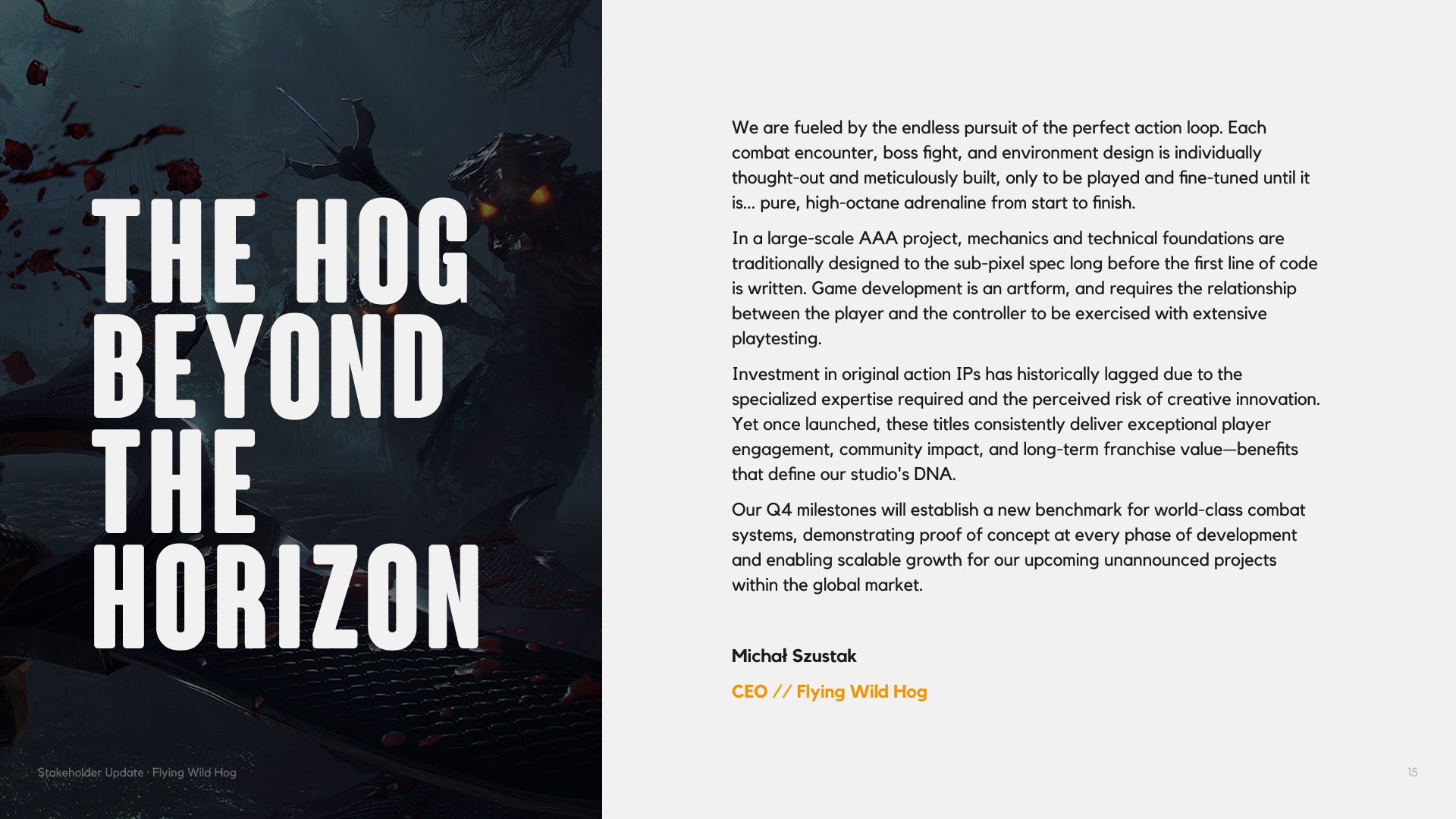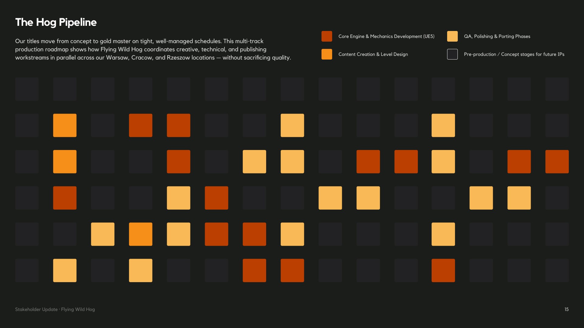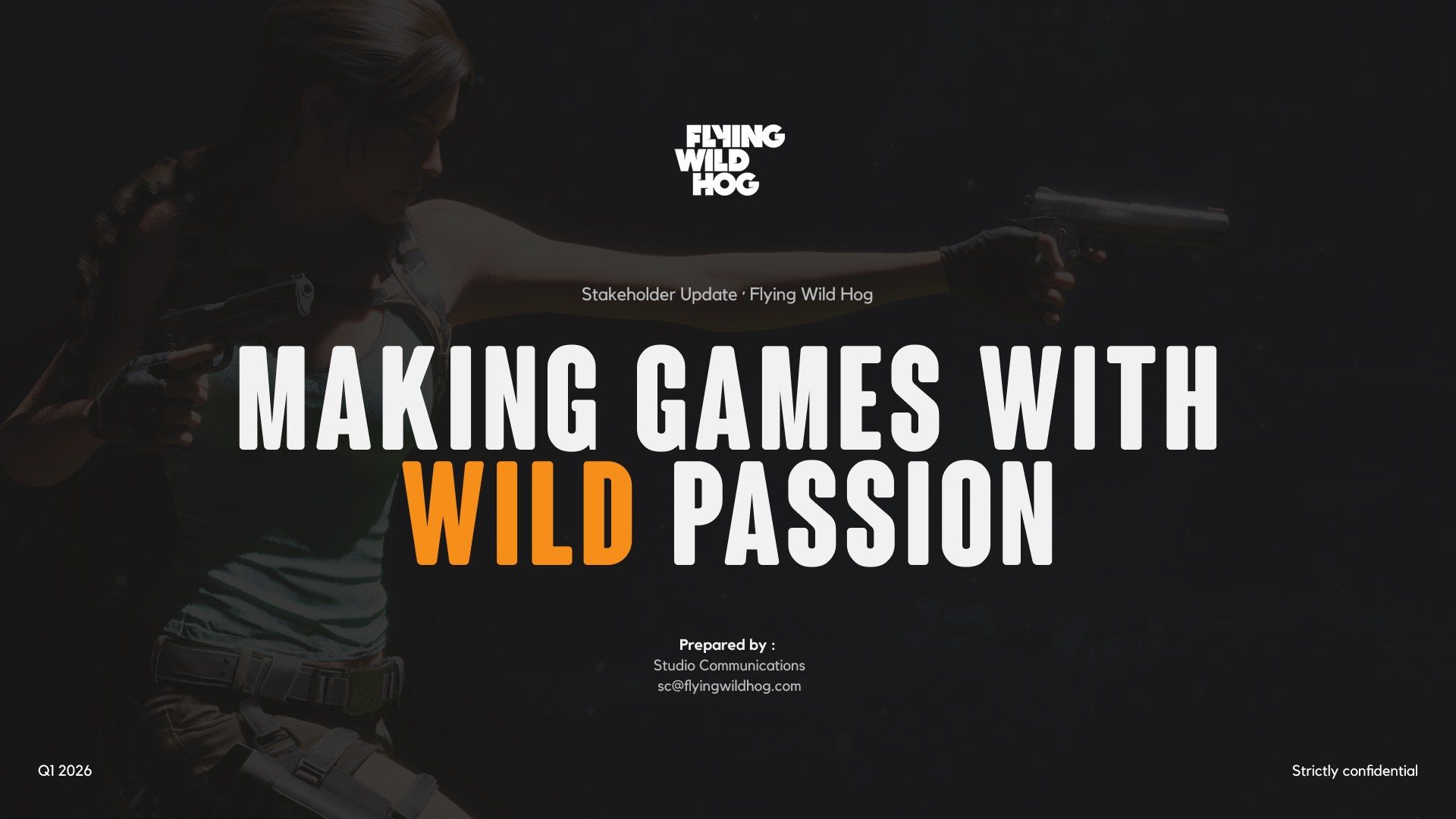 A stakeholder presentation built for Flying Wild Hog, one of Poland's most prolific independent game studios. The deck covers the studio's 16-year history, game portfolio, scale of operations and strategic roadmap — all wrapped in a bold, dark visual identity.