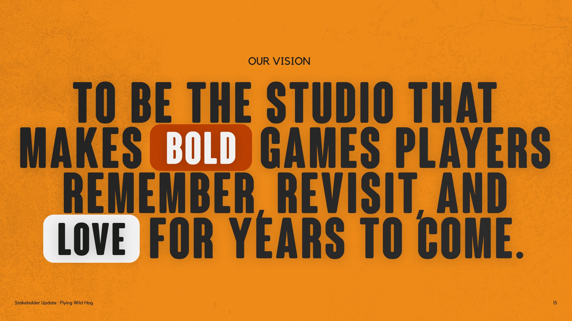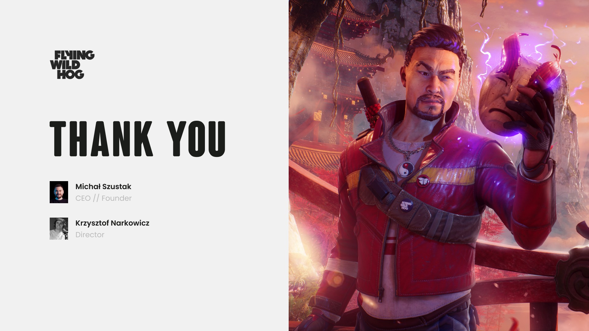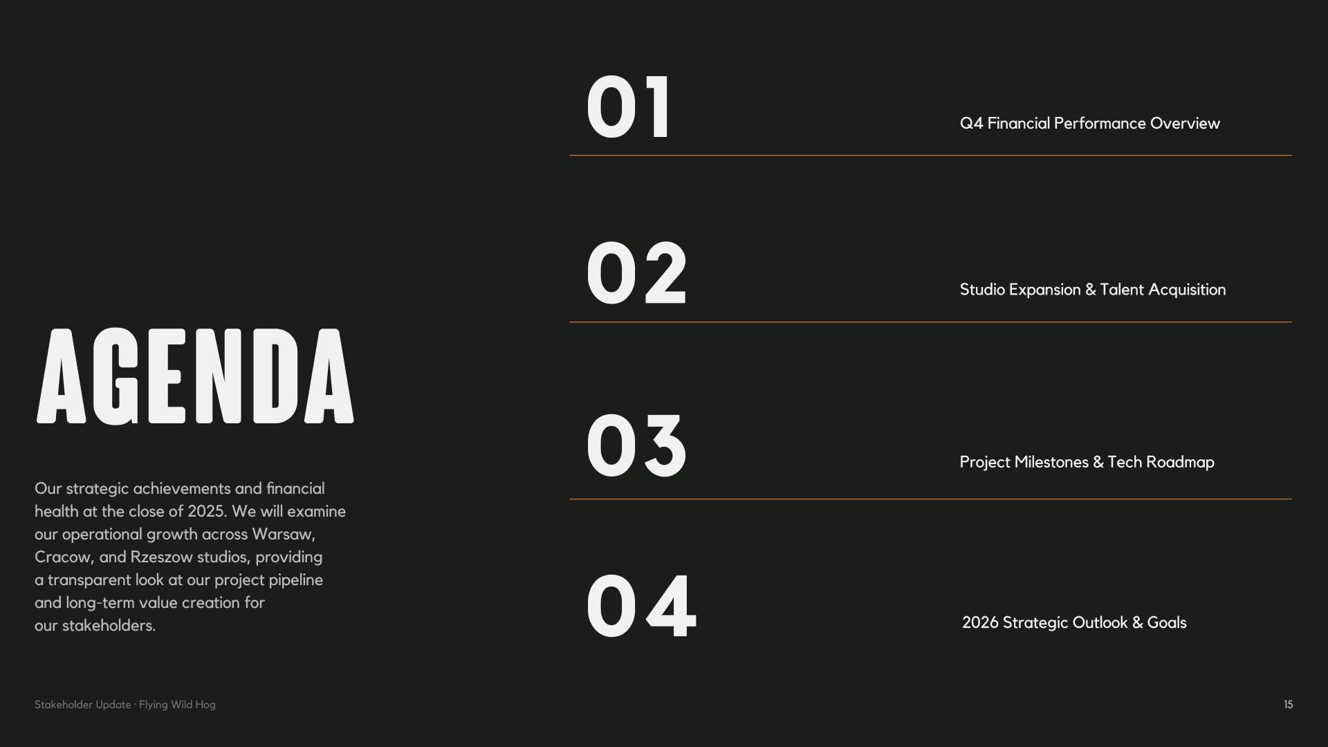 A stakeholder presentation built for Flying Wild Hog, one of Poland's most prolific independent game studios. The deck covers the studio's 16-year history, game portfolio, scale of operations and strategic roadmap — all wrapped in a bold, dark visual identity.
