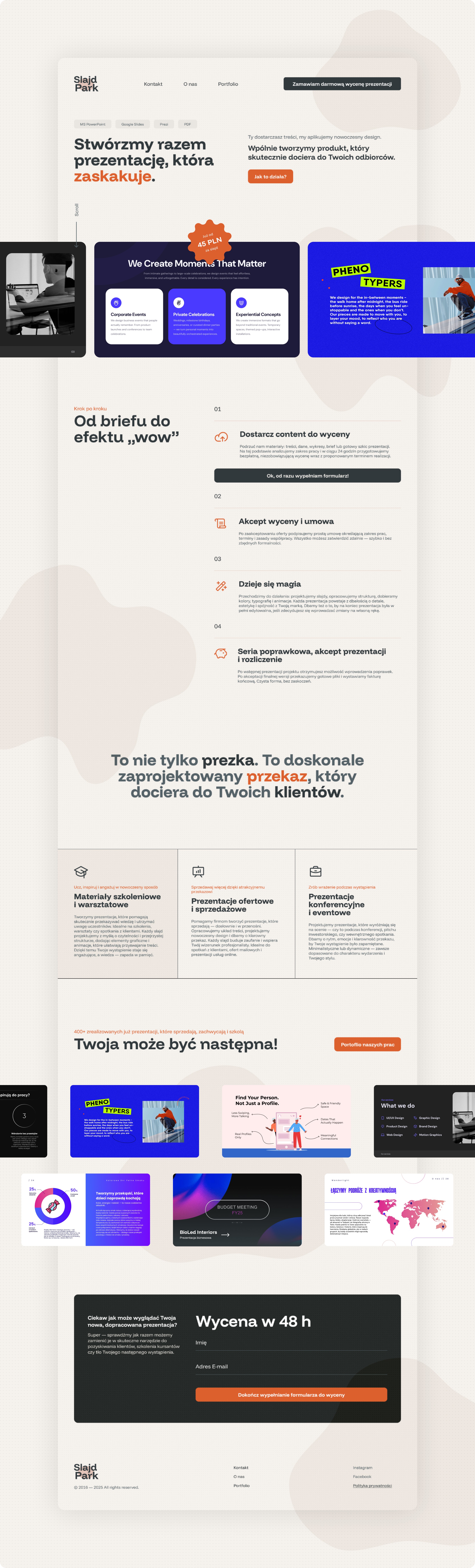 Slajdpark is a modern website designed for a studio specializing in presentation design. The goal of the project was to clearly communicate the offer while guiding users through a simple and structured collaboration process — from initial brief to final delivery. The website positions presentations not just as visual assets, but as powerful business tools that help brands communicate effectively.